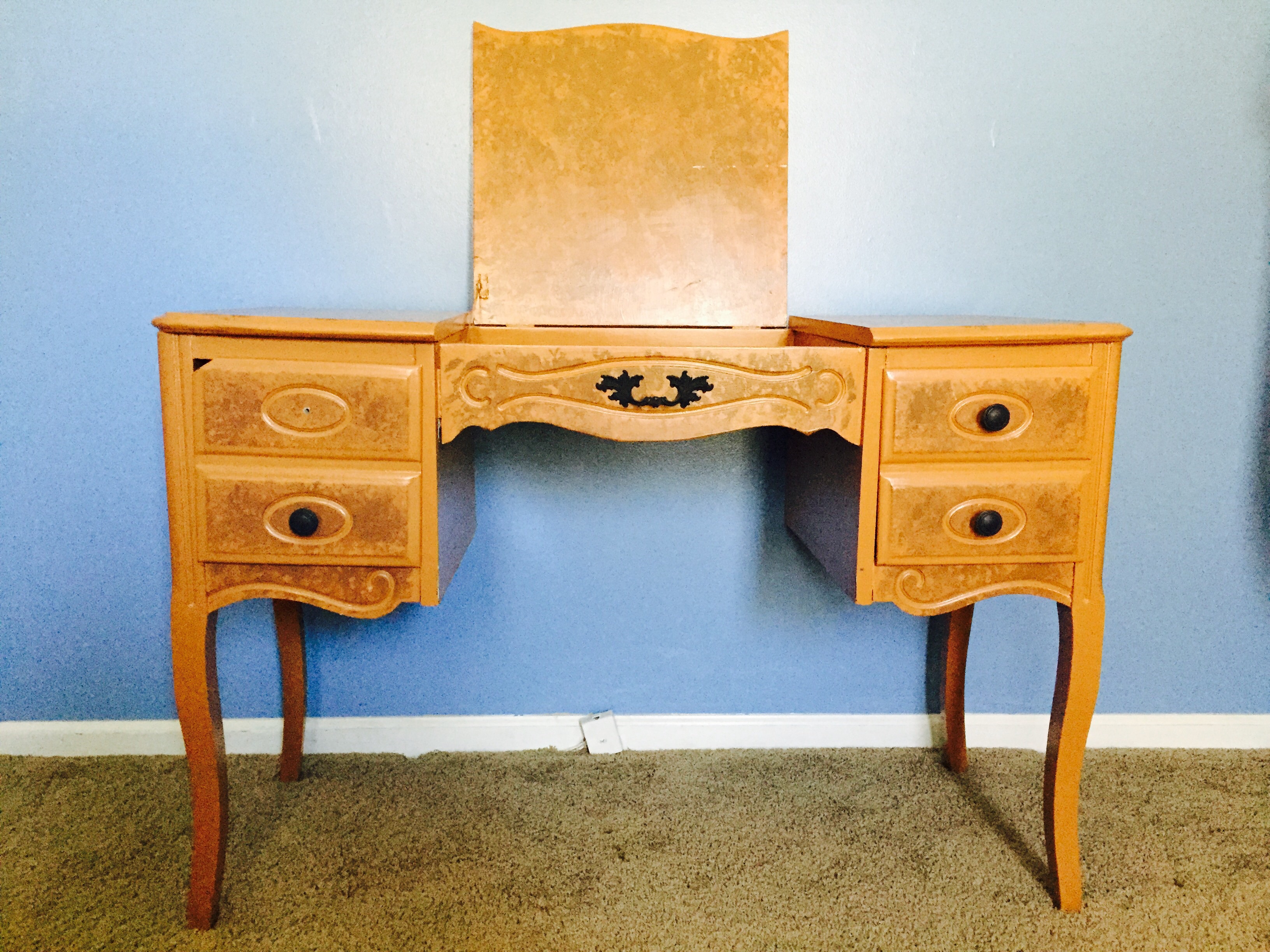 see, i’ve already painted this old vanity/desk once. actually primed, painted, and textured. i was so proud. it looked beautiful on the outside, but as the days passed and i set different things on top of it, i realized the layers of paint were chipping off. i was discouraged to find a glaze underneath; something i should have taken care of before the makeover.